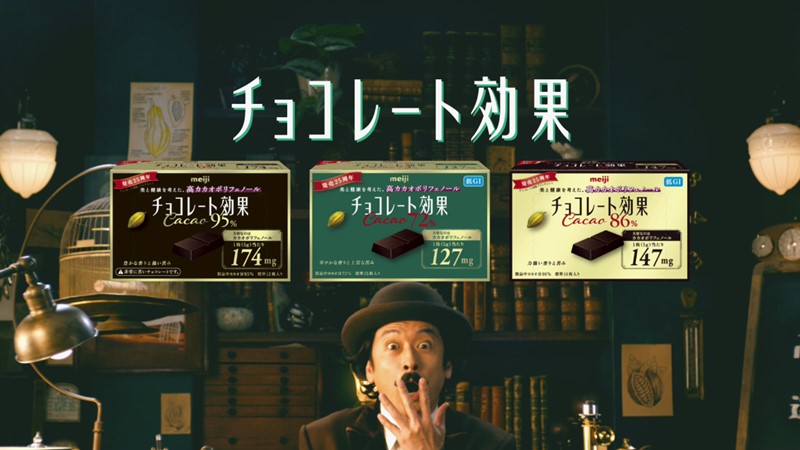 これ、健康を考えるチョコレート「チョコレート効果」の新TVCM「『帰ってきた!チョコ先生!』篇」と「『チョコ先生のレシピ』篇」。