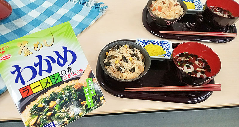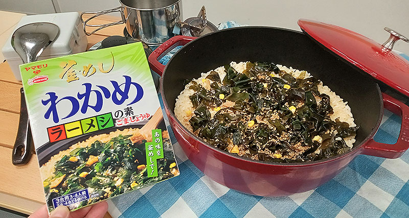 エースコック「わかめラーメン」とのコラボによる「わかめラーメシの素」は、たっぷりのわかめとごま・コーン・メンマを具材に使った釜めしの素。