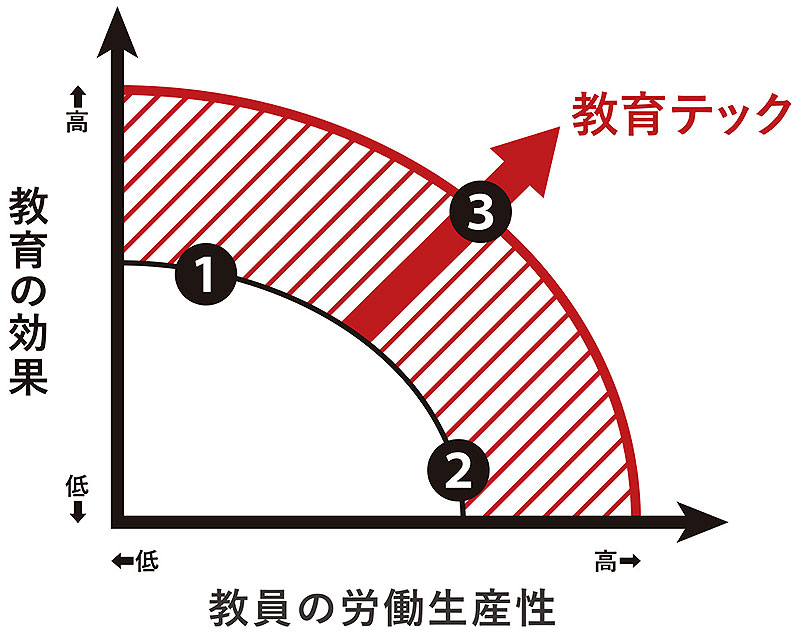 逆に「教育効果」「個別最適な学び」をアップさせようとすると、教員の負担が重なり「教員の労働生産性」は落ちる。