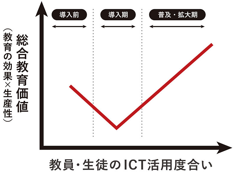 また、民間企業などと同じく、教員・生徒が ICTサービスを活用した新しい実務プロセスを導入し、業務改革を図ろうととした場合、新しいプロセスを理解・適応するため、一時的に業務の効率・生産性が低下するという事実も伝え、「その期間を最小限に抑えるための事前の計画、たとえばリソースを分散し、段階的な導入・トレーニングを行うなどの策定が重要」と説いた。