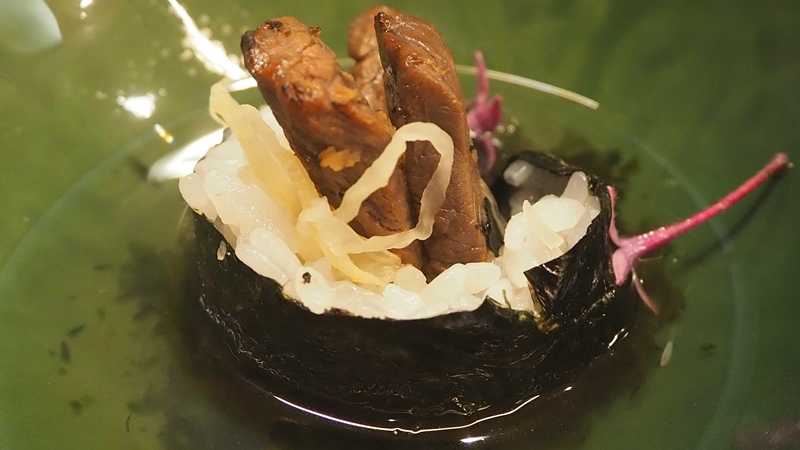 年間12頭ほどしか出荷されないという超レアな「蔓草牛」は、ジャーキーのように噛み応えがあり塩味が効いていた。上品な出汁が合い、エディブルフラワーで食感にひと工夫された茶漬けはまさに締めに最適の一品。もし提供される機会があれば、鮨好きでなくとも逃すことはできないだろう。