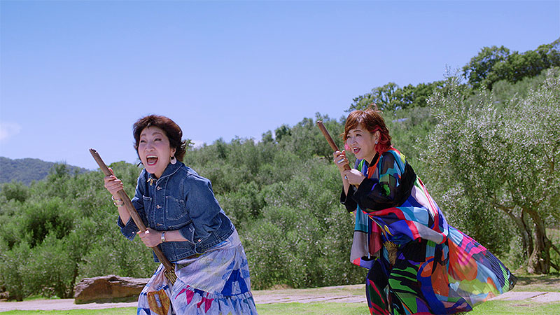 風に乗ってほうきで飛んでいるようなショットや、ハイタッチをするようす、ほうきをギターに見立ててポージングするショットなど、森山良子と清水ミチコの楽しそうな表情に注目。