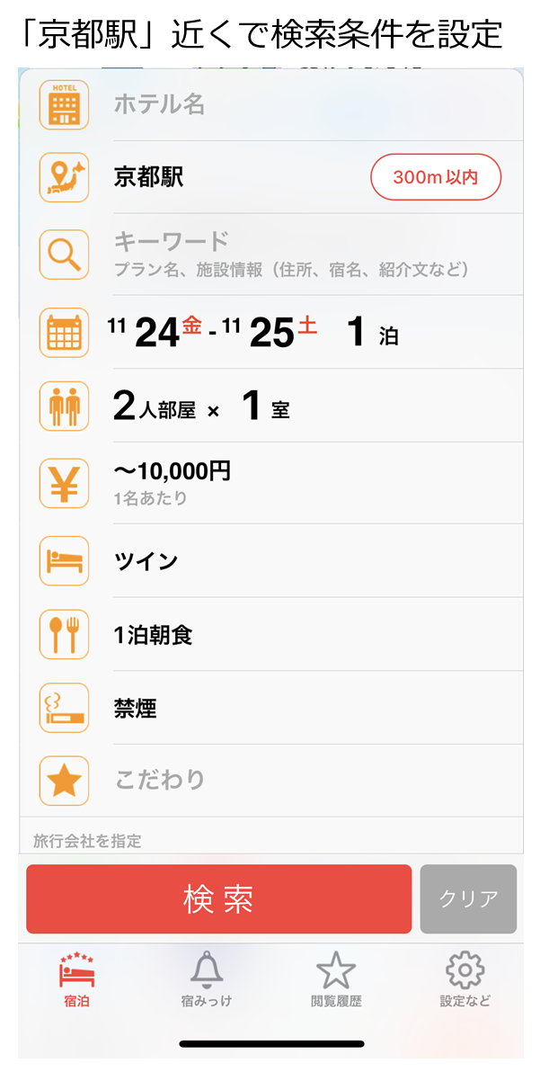 アプリ版BIGLOBE旅行の「宿みっけ」を利用することにより、任意のエリアでの条件設定が可能。