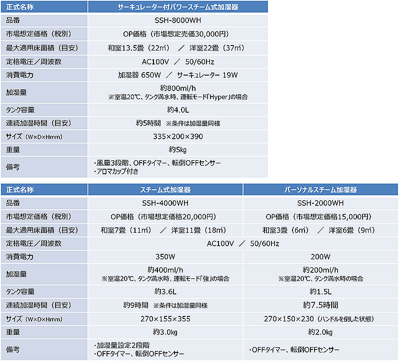 サーキュレーター付UVパワースチーム式加湿器(SSH-8100UVBK)は、洋室22畳対応/風量3段階/急速加湿あり/転倒防止/アロマカップつきで、市場想定価格 3万5000円。大きなリビングをもつ家庭をはじめ、ペットショップや飲食店、スタジオ、ギャラリーといった店舗などもターゲットに。