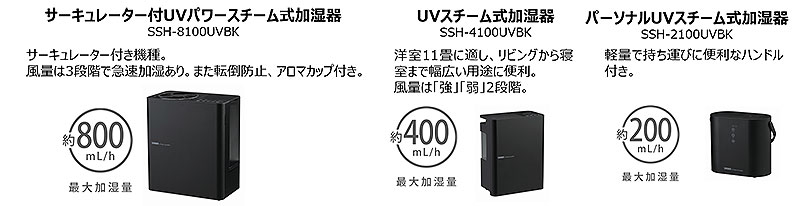 UVスチーム式加湿器(SSH-4100UVBK)は、洋室11畳対応/風量2段階で、一般家庭向き。市場想定価格 2万2000円。