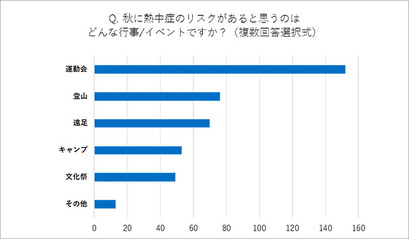 いっぽう、秋に熱中症のリスクがある行事として約8割の人が「運動会」と回答し、一般的に10月に開催されることが多い「運動会」は熱中症リスクがあると考えている人が多いことがわかった。