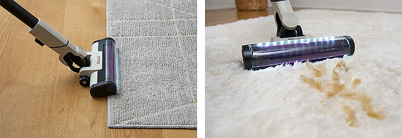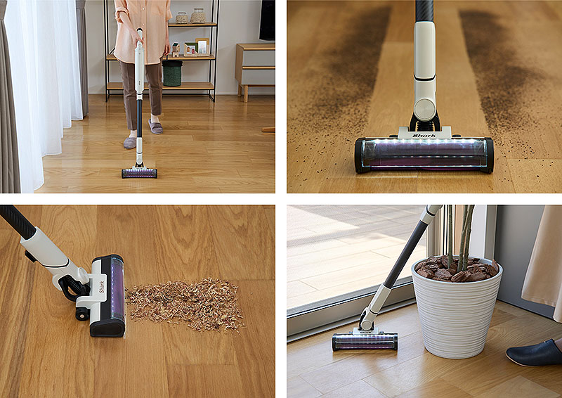 パワーフィンとソフトローラーを組み合わせた Shark の独自ヘッド「ハイブリッドパワークリーン」があらゆる床に常に密着し、大きなゴミから細かいほこりまで、あらゆるゴミをしっかり取り除く。