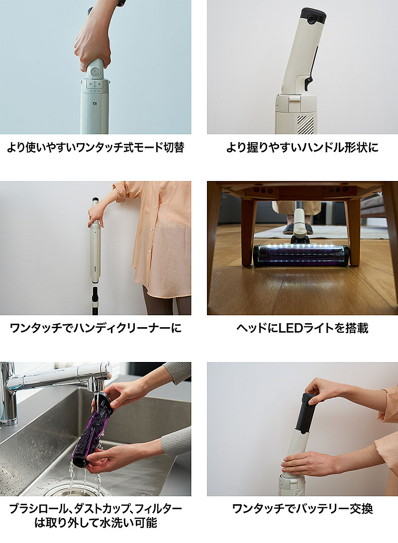 従来モデルよりも最大25%軽量化し、1.5Kg以下のコードレス掃除機のなかで最も優れた掃除性能を実現。