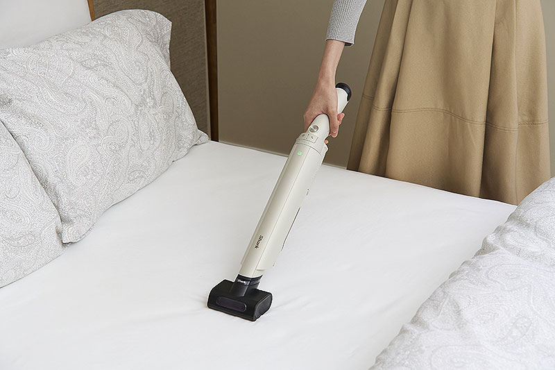 ミニモーターヘッドは、パワーフィンを搭載。布団やマットレスはもちろんさまざまなファブリックも手軽にきれいに。高速回転で汚れや髪の毛を吸い込んでくれる。
