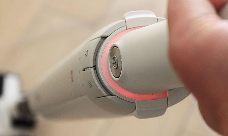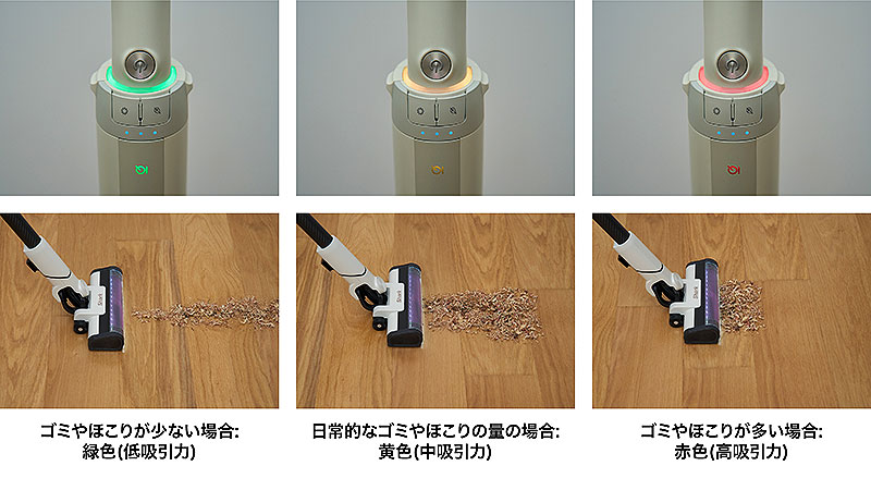 吸引するゴミの量に応じて、ハンディ上部の「iQリング」の色が緑・黄・赤の3色に変化し、見えないゴミも見逃さず、キレイになったことをひと目で確認できる。
