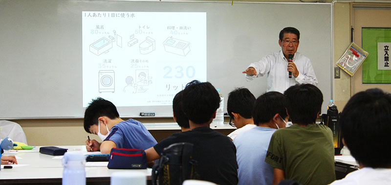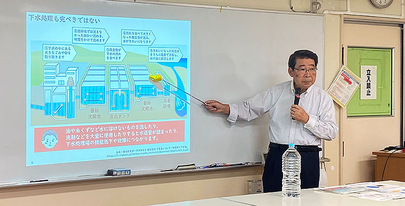 授業の第一部では、水環境の専門家 グローバルウォータ・ジャパン 吉村和就 代表が、世界の水事情や、わたしたちが日々使う水が生活排水となり、水質を汚染し環境に悪影響を与えている事実を説明。
