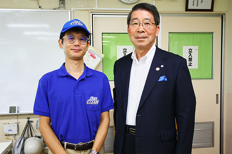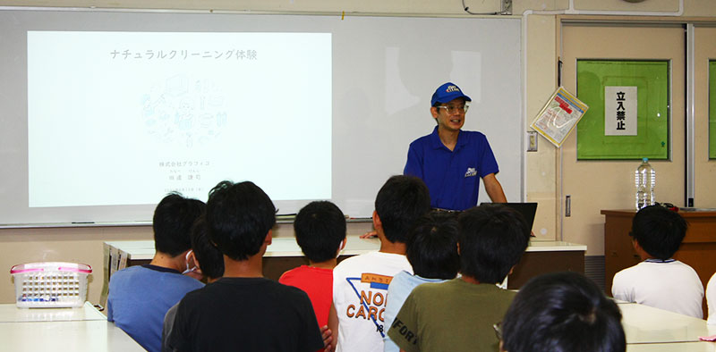 「クエン酸を使って蛇口のカルキ汚れを落とす」と「過炭酸ナトリウムを使って体操着についた汚れを落とす」という2つの実験で子どもたちに「ナチュラルクリーニングで実際にどういった汚れが落ちるのか」を教えたグラフィコ 販売促進部 田邊謙司 部長は、出張授業に込める想いをこう伝えた。