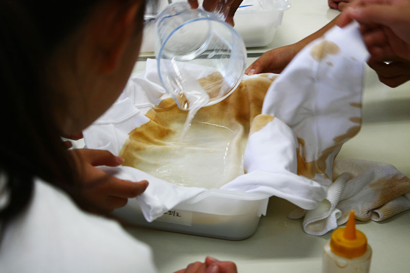 第二部のナチュラルクリーニング体験では、汚れを“酸性とアルカリ性” に分けて考え、“酸性の汚れにはアルカリ性” 、“アルカリ性の汚れには酸性”で落とすことを実験と座学を通して学んでいただきました。