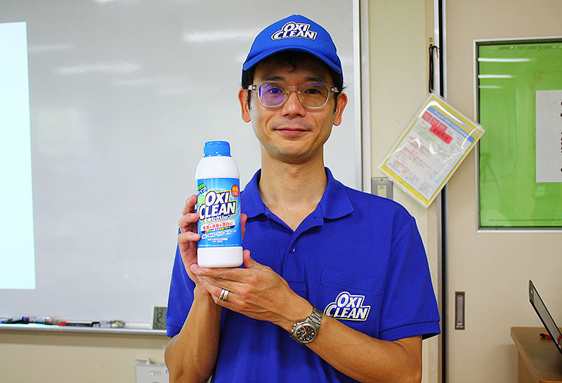 オキシクリーン出張授業「身近な汚れから考えるSDGs」第二部では、クリンネスト1級の資格を持つお掃除のプロ、グラフィコ 販売促進部 田邊謙司 部長が、「ナチュラルクリーニングで実際にどういった汚れが落ちるのか」を実験。汚れが落ちる仕組みについて子どもたちと共有した。