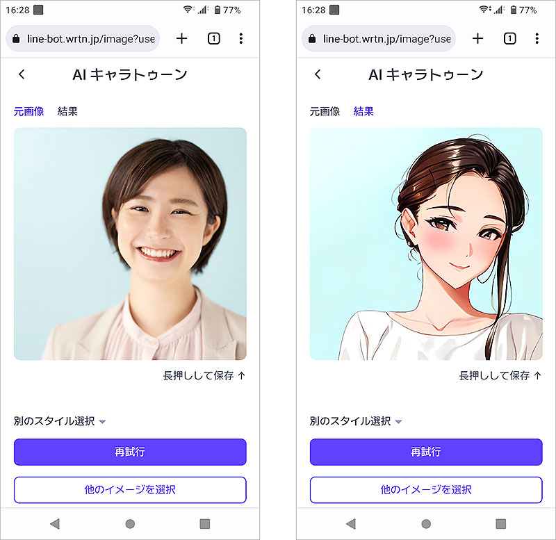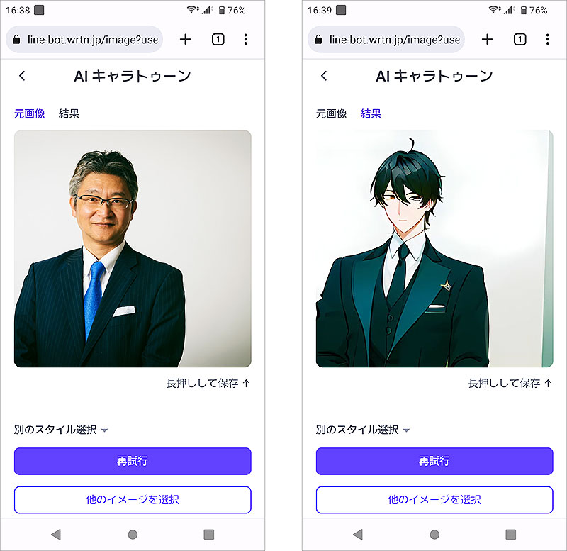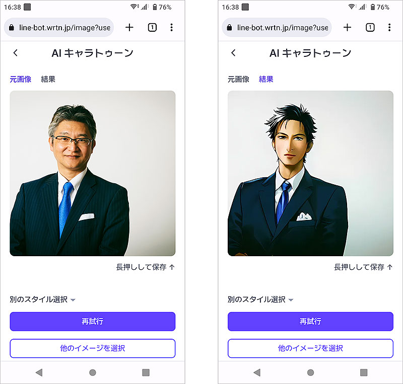 LINE@リートンAIラボ「AIキャラトゥーン」は、ワンショット人物画像はもちろん、こうして複数ショットもこんな感じでアニメ化できる!