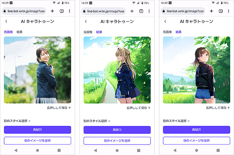 うしろに風景が入り込んだ画像をLINE@リートンAIラボの「AIキャラトゥーン」にアップすれば、こんな感じで無限にアニメ化できる!