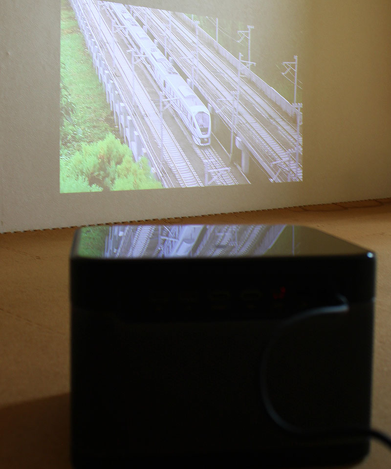 試しに、昼間の太陽光が窓から入り込む部屋で、照射壁に対して斜めに映像をあててみても、こんな感じで見事にきれいに映る↓↓↓