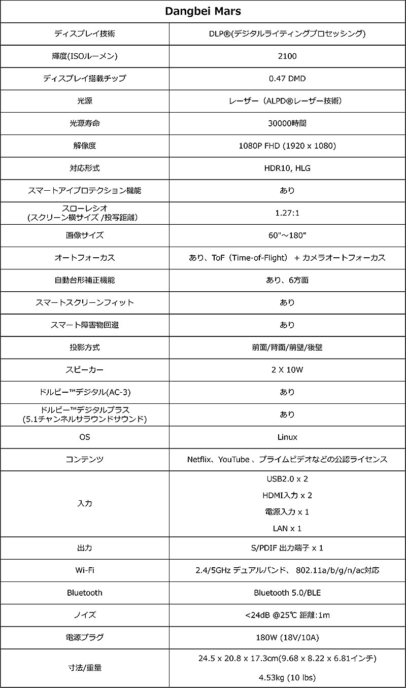 最大180インチのスクリーンでフルHD の映像を楽しめるうえ、迫力あるサウンドもDangbei「Mars」のアドバンテージ。