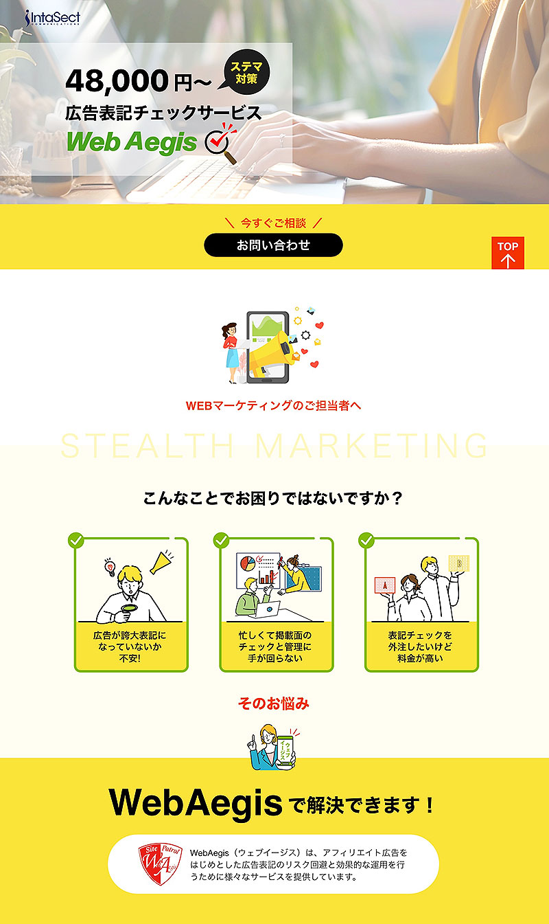 ―――インタセクトは、ステマ規制の開始にあわせ、「WebAegis」(ウェブイージス)専用サービスサイトを新たに開設するとともに、4万8,000円から広告表記のチェックが可能な、従来よりもリーズナブルなプランも提供を開始したから、詳細は公式サイトへ↓↓↓
