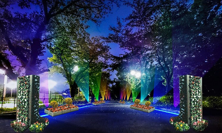 ユニバーサルデザイン遊具がある「もり公園にじいろ広場」の名称にちなみ、夜間17時30分~21時は虹色(7色)にライトアップ。