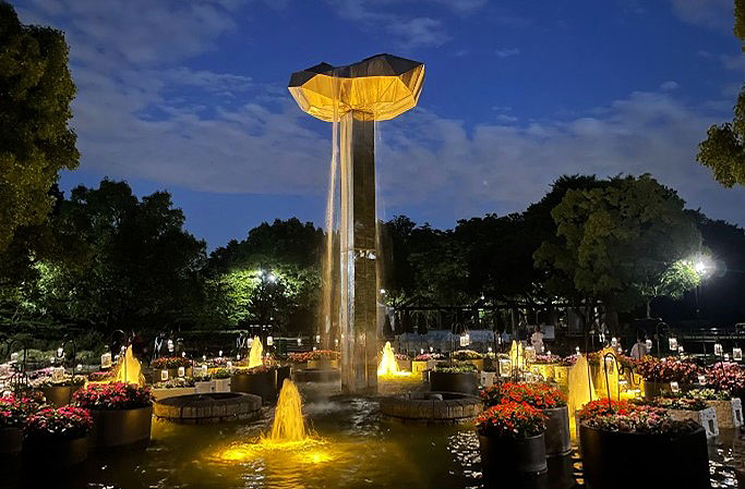 また、石垣壁泉とモニュメント噴水のサンパチェンスの水中花壇では、昨年に引き続き、ソネングラスで温もりのあるライティングで、モニュメントのライトアップとともに秋の夜長の園内を優しく灯してくれる。