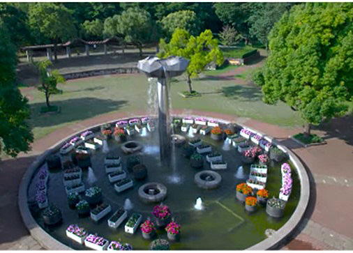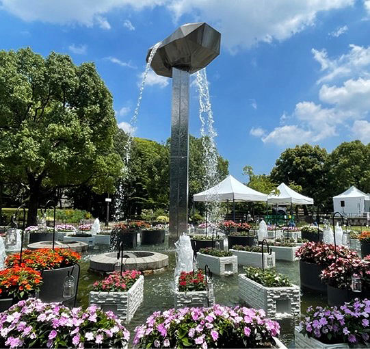 花の広場のモニュメント噴水及び石垣壁泉に、赤と白を基調としたサンパチェンスの水中花壇が出現し、園内を特別な雰囲気に。