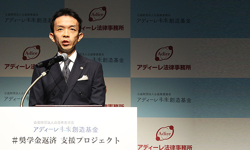 概要:奨学金返済がネックになり、留学や転職、起業など、夢の一歩目を踏み出せずにいる若者をアディーレ未来創造基金が支援する基金型プロジェクト