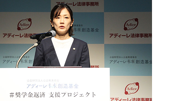 「#奨学金返済支援プロジェクト」は、奨学金返済がネックになり、留学や転職、起業など、夢の一歩目を踏み出せずにいる若者を、アディーレ未来創造基金が支援する基金型プロジェクト。