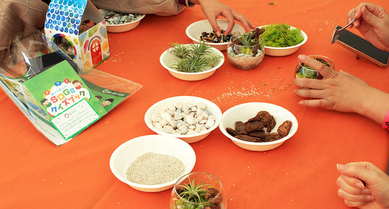 スポーツ教室のあとは、SDGsワークショップで親子いっしょに工作を楽しむ姿も……。