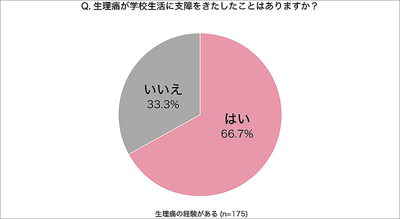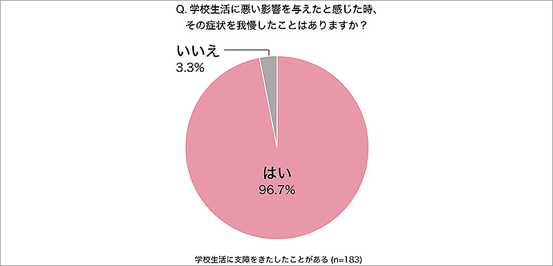 調査の結果、生理痛経験のある高校生の7割弱が「生理痛が学校生活に支障をきたしたことがある」と回答し、そのうち、96.7%がその症状を「我慢をしたことがある」と回答していた。