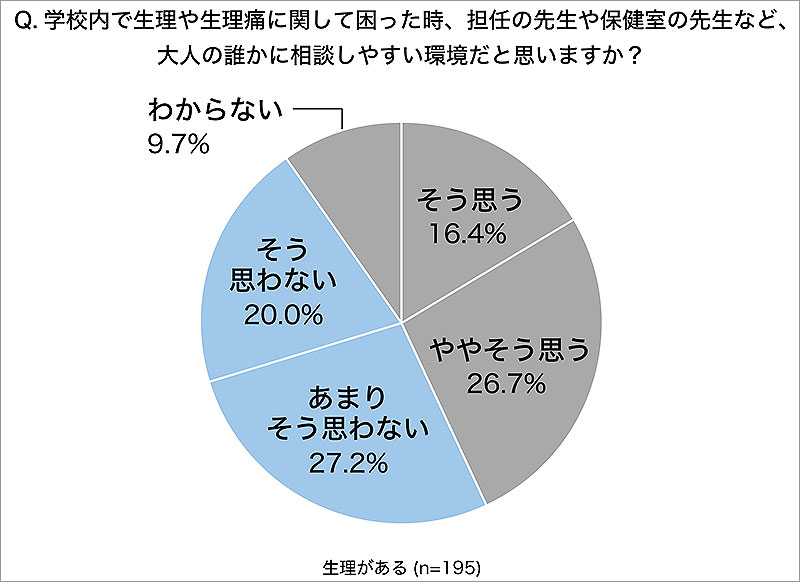 また、学校内で生理や生理痛に関して困った時、担任の先生や保健室の先生など、大人の誰かに相談しやすい環境だと思うかという質問に対し、「あまりそう思わない」「そう思わない」との回答は合わせて約5割にのぼった。