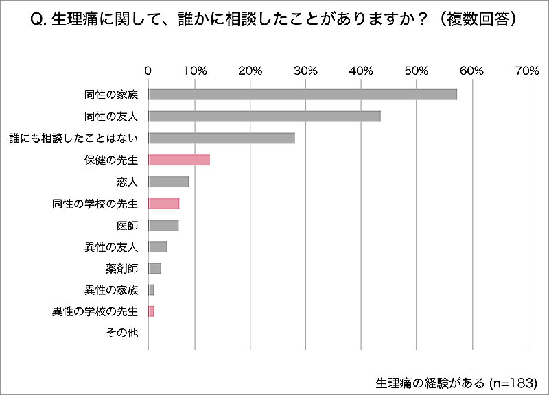 生理痛に関して、誰かに相談したことがあるか聞いたところ、保健の先生に相談したことがある高校生は約1割、学校の先生への相談は1割未満にとどまるという切実な事情がみえてきた。