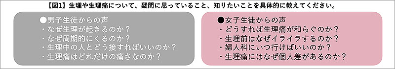生理に関して疑問に思っていること、知りたいこととして、生理がある女子生徒からは「生理痛を和らげる方法」 「婦人科を受診するタイミング」を知りたいなどの声が上がり、いっぽうで、生理を経験していない男子生徒からは、「生理の時の接し方」や、そもそも「なぜ生理が起きるのか?」などの疑問が上がった。