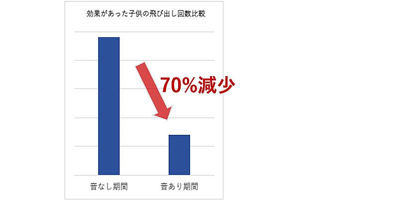 また、効果があった児童を対象に、音あり・なしの加速回数を比較すると、70%の減少があったことが確認できた。