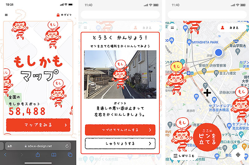 イーデザイン損保「もしかもマップ」では、身近にある危険な場所を見つけて、ユニークなキャラクター「もし子」のピンをマップに立てることができる。