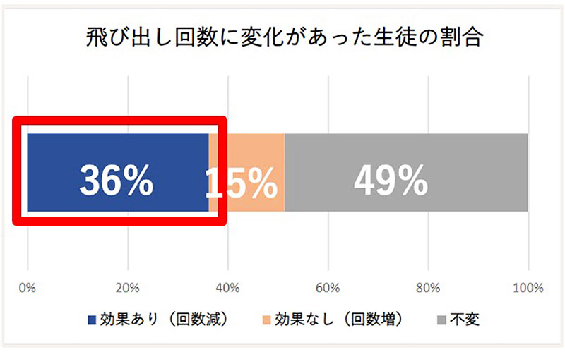音あり・なし期間の駆け出し回数をそれぞれ調べたところ、62.5%の児童が音ありの期間に駆け出し回数が減り、飛び出し行動の抑制に効果があったと確認できた。