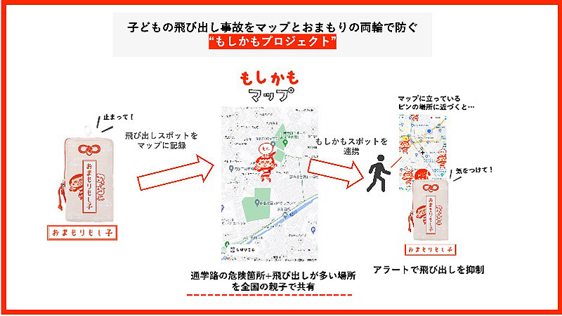 この「もしかもマップ」で子どもの危険に対する日常的な意識向上を促進しつつ、事故の原因として最も多い衝動的な「飛び出し」にも対策を講じるべきと考え、今回「おまもりもし子」を開発。