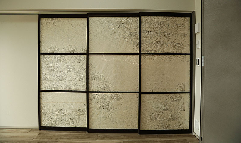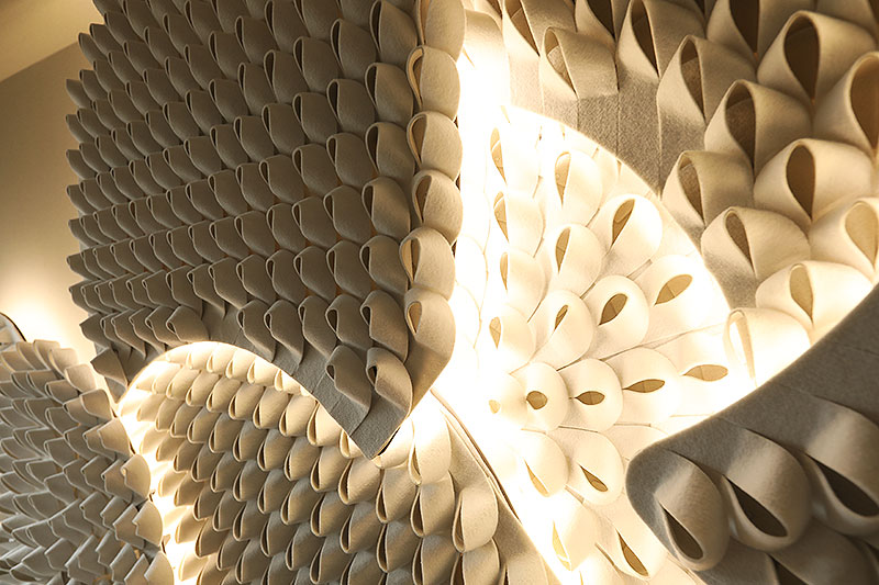 画像のような番組で使用したフェルト材を壁面アートにアップサイクルしたり、松の木建具を設置したりと、廃棄物削減にむけた手法のひとつとしてその有効性を検証していく。