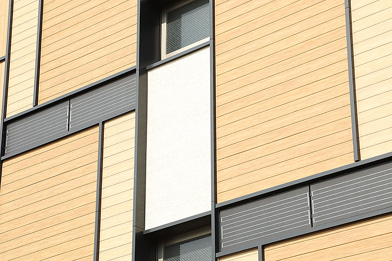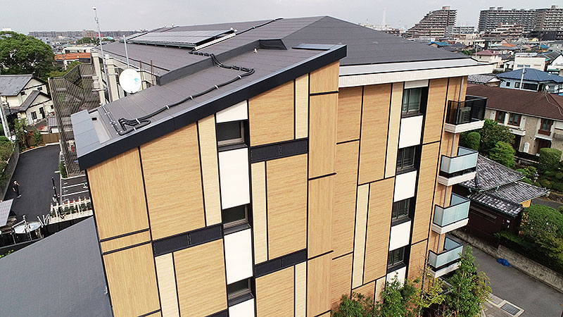 壁面は、太陽光の反射による眩しさを低減するための防眩加工を施した太陽光発電パネルをサイディングと組み合わせて配置し、デザイン面にも配慮。
