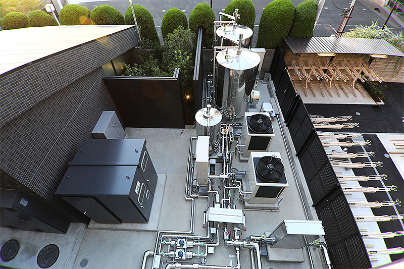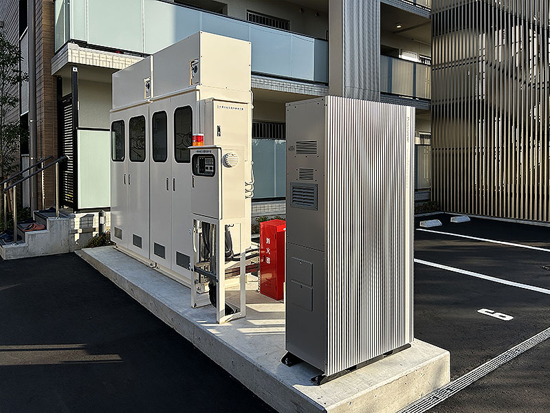 屋外共用部には、発電時に CO2 排出がない、発電効率56%の高発電効率純水素型燃料電池5kW パナソニック建材エンジニアリング製)を設置。