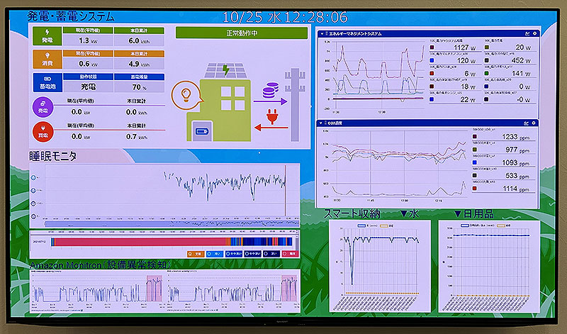 さらに再エネ自立オフグリッドとして、住戸内のエネルギー消費量や温湿度、CO2濃度、日用品の残量、睡眠の質などの生活情報を一元管理し、テレビに投影し見える化し、スマートな暮らしを住民たちと共有しながらアップデートしていく。