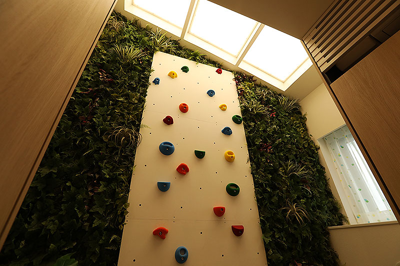 外光が差し込んでいるようなアウトドア演出空間で、ボルダリングや秘密基地がある部屋で家族で楽しめる「アクティブライフプラン」空間も設置。