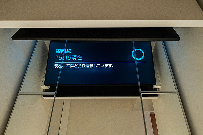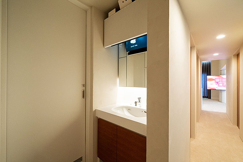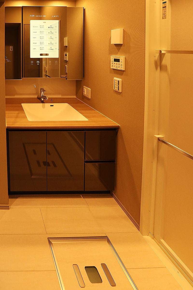 また、洗面台の鏡は、インフォメーションミラーとし、天気や交通情報をリアルタイムに映し出してくれる。