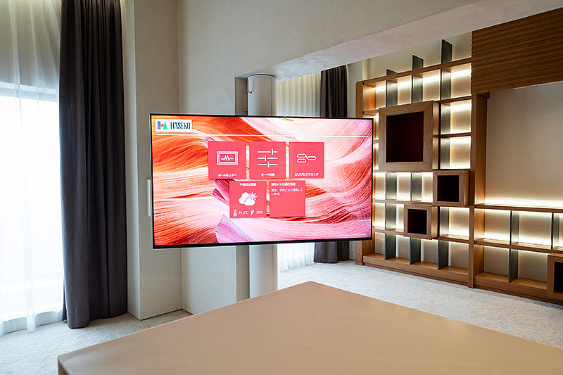 たとえば、さまざまな角度に自動調整でき、API(アプリケーション・プログラミング・インターフェース:Application Programming Interface)連携制御もできる可動テレビのほか、家庭用ロボットやエアコン、カーテン、照明なども APIと連携制御し、居住者のキャラクターやライフスタイル、習慣にあわてカスタマイズできる。