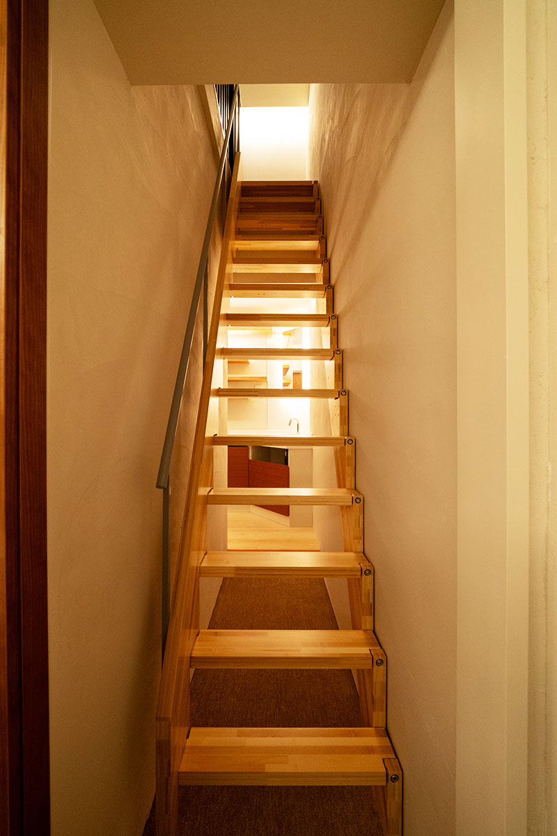 これは電動可動階段。階段の上り下りがない場合は、折りたたんで空間を有効活用できるうえ、API連携制御もできる。