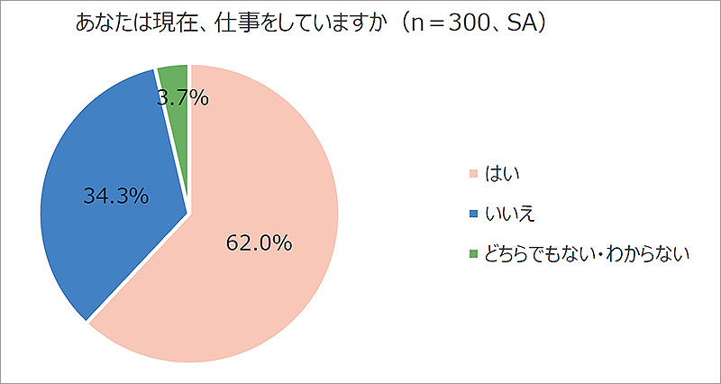 経営者の妻300名に、現在、仕事をしているか聞いたところ、「はい」と回答したのは62.0%だった。
