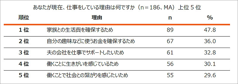 さらに、現在、仕事をしている経営者の妻186名に、仕事をしている理由を聞いたところ、1位は「家族との生活費を確保するため」(47.8%)で、2位は「自分の趣味などに使うお金を確保するため」(36.0%)、3位は「夫の会社を仕事でサポートしたいため」(32.8%)という理由だった。