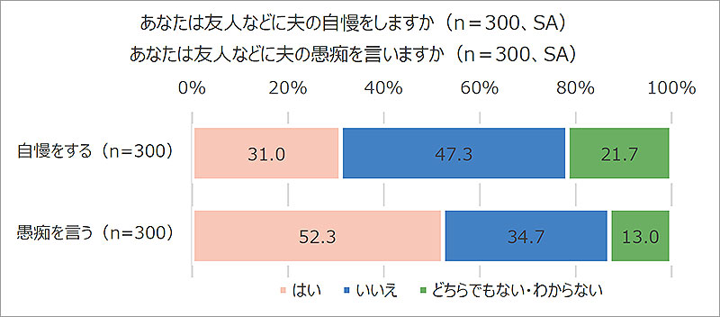 また、友人などに夫の愚痴を言うか聞いたところ、「はい」と回答した経営者の妻は52.3%で、夫の自慢をする妻に対して、夫の愚痴を言う妻の割合が多く、夫の自慢よりは愚痴を言う傾向があることが分かった。
