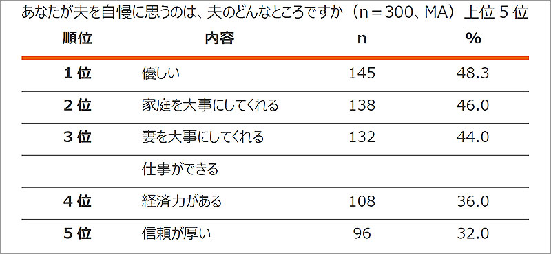 経営者の妻が夫を自慢に思うところ1位は「優しい」ところ(48.3%)