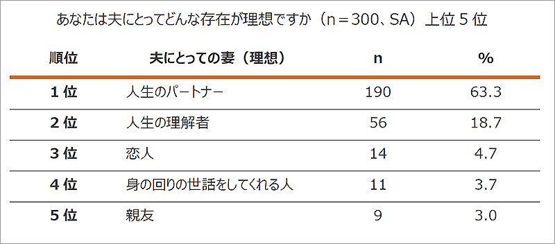 さらに、理想とする夫にとっての自分の存在は、2位が「人生の理解者」(18.7%)、3位が「恋人」(4.7%)だった。